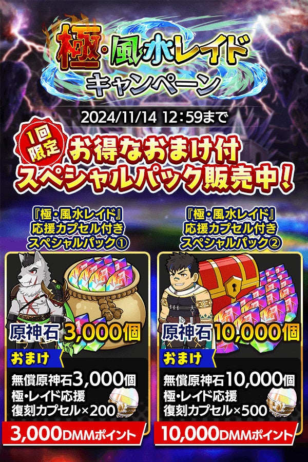 また、原神石がおトクに入手できる「極・風水レイドキャンペーンスペシャルパック」も同時に登場!