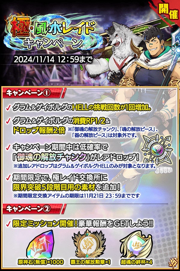 キャンペーン期間中「グラム」「ゲイボルグ」の挑戦回数増加やレイド救援時のRP半減、ドロップ報酬2倍となるおトクなキャンペーンです。