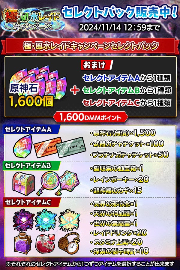 原神石に加えて、ガチャチケットや限界突破アイテムなど、お好きなアイテムを選択できる「極・風水レイドキャンペーンセレクトパック」が登場!
