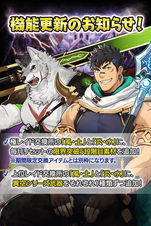 キャンペーン期間限定とは別枠で毎月リセットの限界突破5段階目用の素材や「異空シリーズ」武器も1種ずつ追加されます!