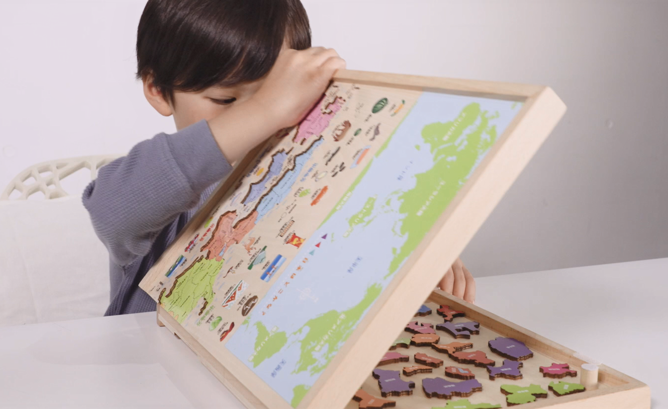 さらに、パズル板には、世界地図と日本地図のイラストがあり、「太平洋」など日本の周りの海の名前も記載。「日本はどこかな?」とお子さんが世界地図の中から日本を探せるようになっています。世界から見た日本の位置や大きさが見てわかり、日本から世界へと興味の幅が広がります。