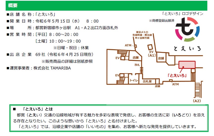 東京都交通局では、都営交通初となる沿線セレクトショップ「とえいろ」を令和6年5月15日(水)に都営新宿線市ヶ谷駅構内にオープンします。