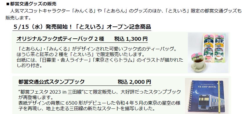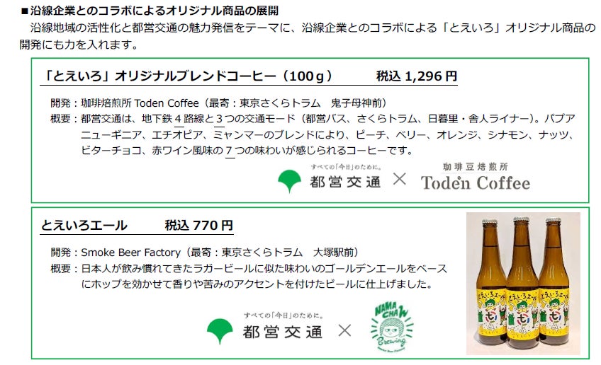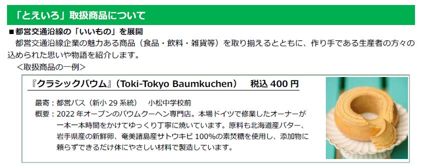「とえいろ」では、都営地下鉄、都営バス、東京さくらトラム(都電荒川線)、日暮里・舎人ライナーの沿線にある店舗等の魅力ある商品(食品・飲料・雑貨等)を取り揃えるとともに、沿線企業と都営交通とがコラボレーションした、ここでしか買えない「とえいろ」オリジナル商品なども販売し、沿線地域の魅力発信や活性化に貢献してまいります。