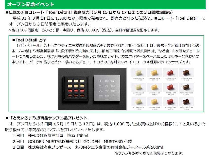 さらに、オープンからの3日間は記念イベントとして、平成31 年3月に発売後、即完売した伝説のチョコレート「Toei Détail」を限定販売いたします。