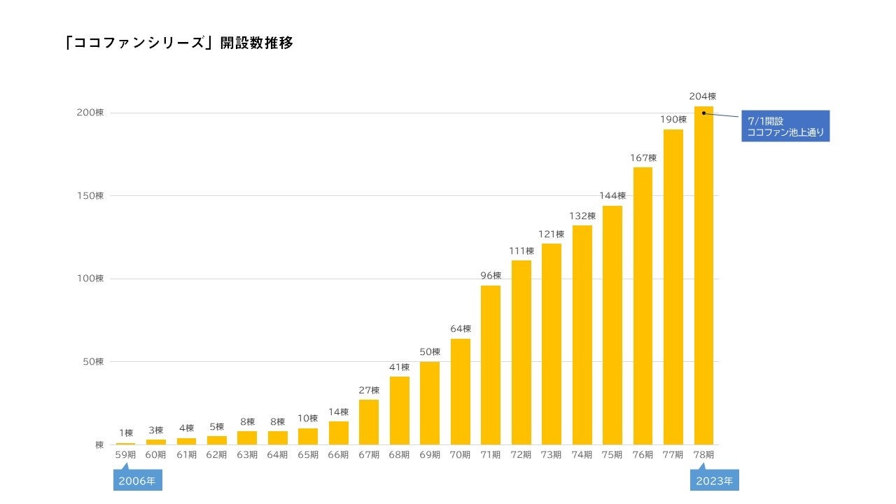 今回の新規開設により、2006年第1号拠点オープンから数え、当社が運営する高齢者住宅「ココファンシリーズ」の棟数は200棟、居室数は10,213室となりました。