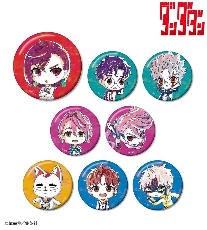 綾瀬 桃、オカルン、オカルン(変身)、白鳥 愛羅、白鳥 愛羅(変身)、ターボババア、円城寺 仁、円城寺 仁(変身)のデフォルメイラストを新たなタッチで魅力的に表現し、缶バッジに仕上げました。