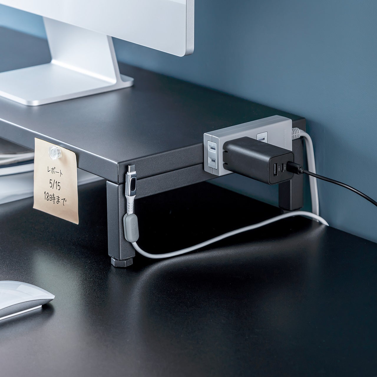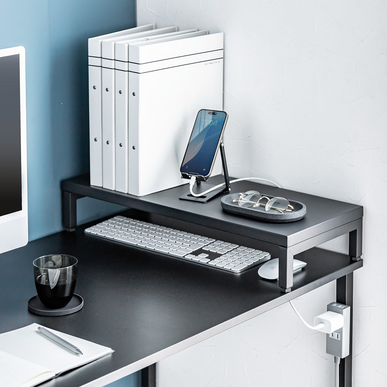 デスクサイドに設置することにより、デスクシェルフとしても使えます。背面に板などの障害物が無いのでケーブル類をスッキリ配線できます。