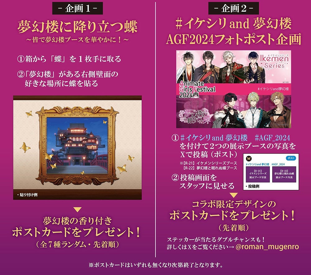 株式会社サイバードが運営する人気恋愛ゲーム「イケメンシリーズ」とのコラボキャンペーン「#イケシリand夢幻楼 AGF2024フォトポスト企画」では、「#イケシリand夢幻楼」「#AGF_2024」のハッシュタグをつけて展示ブースの写真をXに投稿し、R-22「夢幻楼と眠れぬ蝶」ブースのスタッフに見せていただくと、先着でコラボ限定デザインのポストカードをプレゼントいたします。