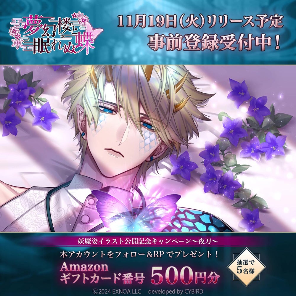 DMM GAMES新作女性向け恋愛ゲーム「夢幻楼と眠れぬ蝶」ウエハラ蜂先生描きおろし「妖魔姿」イラスト公開を記念しAmazonギフトコード番号が当たるXキャンペーン開催!AGF2024ブース続報も!