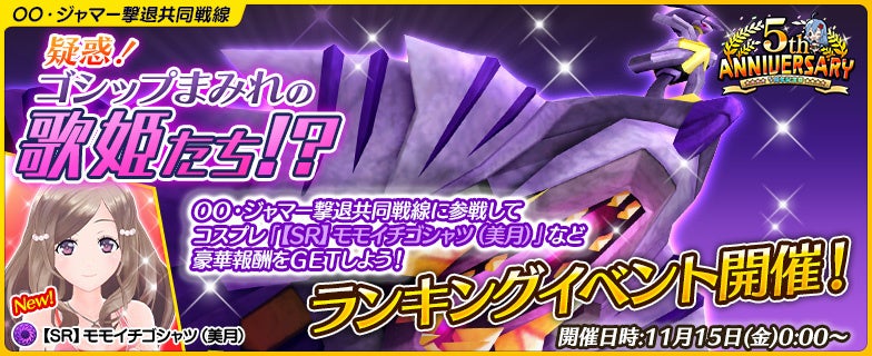 5周年記念開催となる共同戦線イベント「疑惑!ゴシップまみれの歌姫たち!?」では、イベント限定SRコスプレ「モモイチゴシャツ(美月)」や大量のジェムをはじめ、共同戦線でしか入手できないアイテムなどが入手可能なイベント、ぜひお楽しみください!