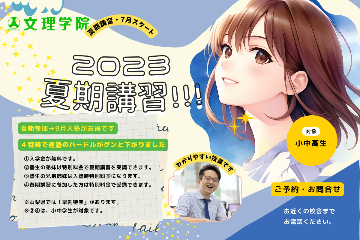 いよいよ夏期講習の受付を開始しました。6月・7月には全校舎で夏期講習説明会を開催、山梨県内においては中学生を対象とした「早割」(早期申し込み割引制度)等もご用意しており、全地区・全校舎で心から皆様のお申し込みをお待ちしています。