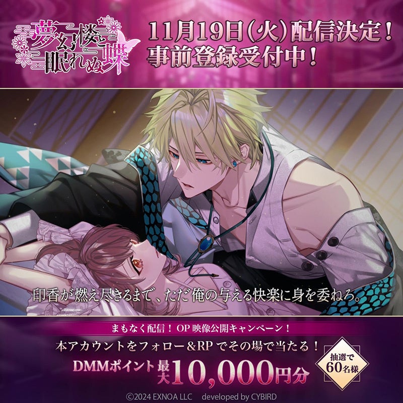 DMM GAMESを運営する合同会社EXNOA(本社:東京都港区、CEO:村中 悠介、URL:https://games.dmm.com/)は、11月19日(火)にリリース予定のオトナの女性向け恋愛ゲーム「夢幻楼と眠れぬ蝶」のオープニング映像を公開いたしました。また、公開を記念してDMMポイントが最大1万円分当たるXキャンペーンを開催いたします。