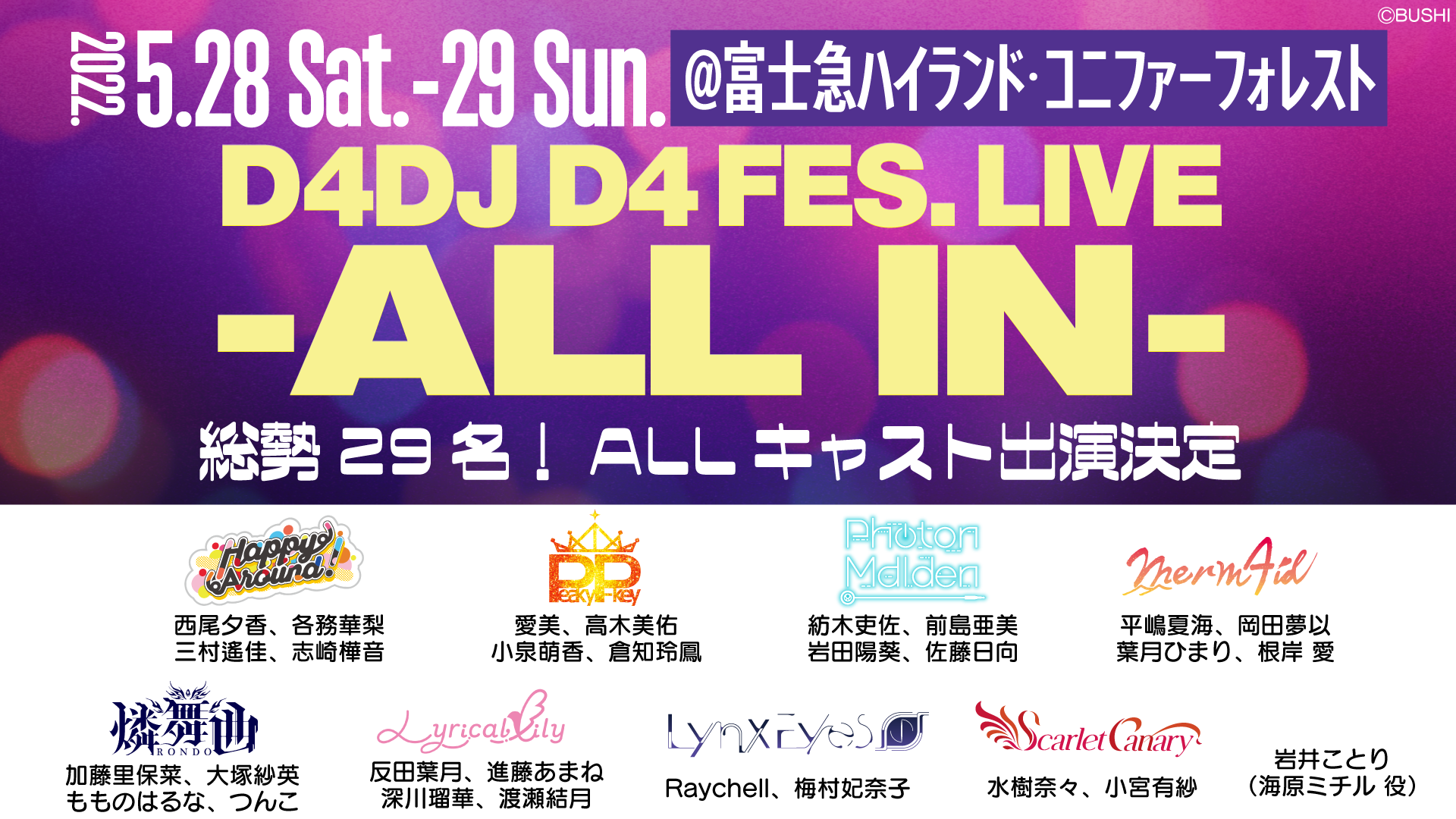 株式会社ブシロードミュージック(本社:東京都中野区、代表取締役社長:森川浩)は、来年5月に富士急ハイランド・コニファーフォレストにて開催の大型野外ライブ「D4DJ D4 FES. LIVE -ALL IN-」に関する新情報を発表したことお知らせいたします。