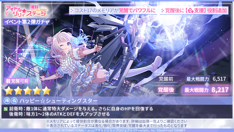 - 新★5メモリア「高らかと響き渡る歌声の中で」「大丈夫、みんながいるから」が登場!さらに★5メモリア「ハッピー☆シューティングスター」「姫歌を脅かす2つの新星」等も再登場するガチャも開催!