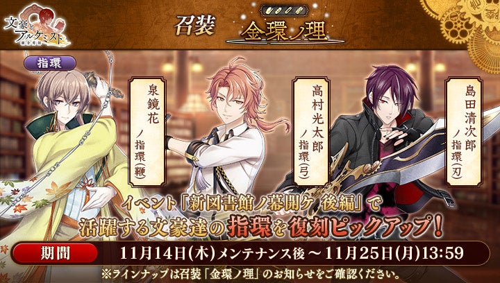 召装『金環ノ理』のラインナップを更新いたしました。この召装では、イベント『文史紀伝「新図書館ノ幕開ケ 後編」』で活躍する「泉鏡花」「島田清次郎」「高村光太郎」の指環を一定の確率で入手できます。