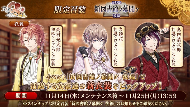 さらに、イベントと同時に開催される限定召装『新図書館ノ幕開ケ 後編』にて新規追加された「泉鏡花」「島田清次郎」「高村光太郎」の〈和風クロックパンク衣装〉を編成すると、得点の獲得率がそれぞれ30%上昇します。