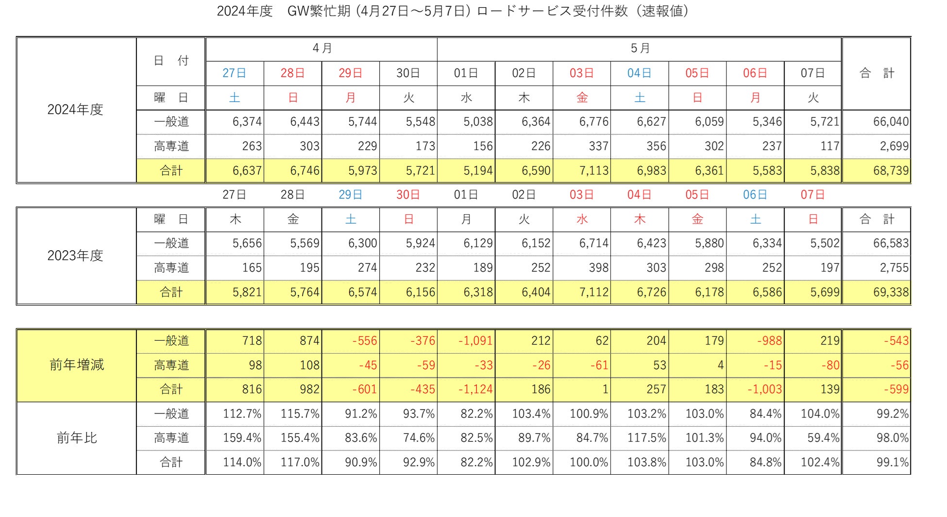 期間中、全国で受け付けたロードサービス件数は6万8,739件で、前年同期間の件数と比較すると599件減少しました。最も件数が多かったのは5月3日(金)の7,113件でした。