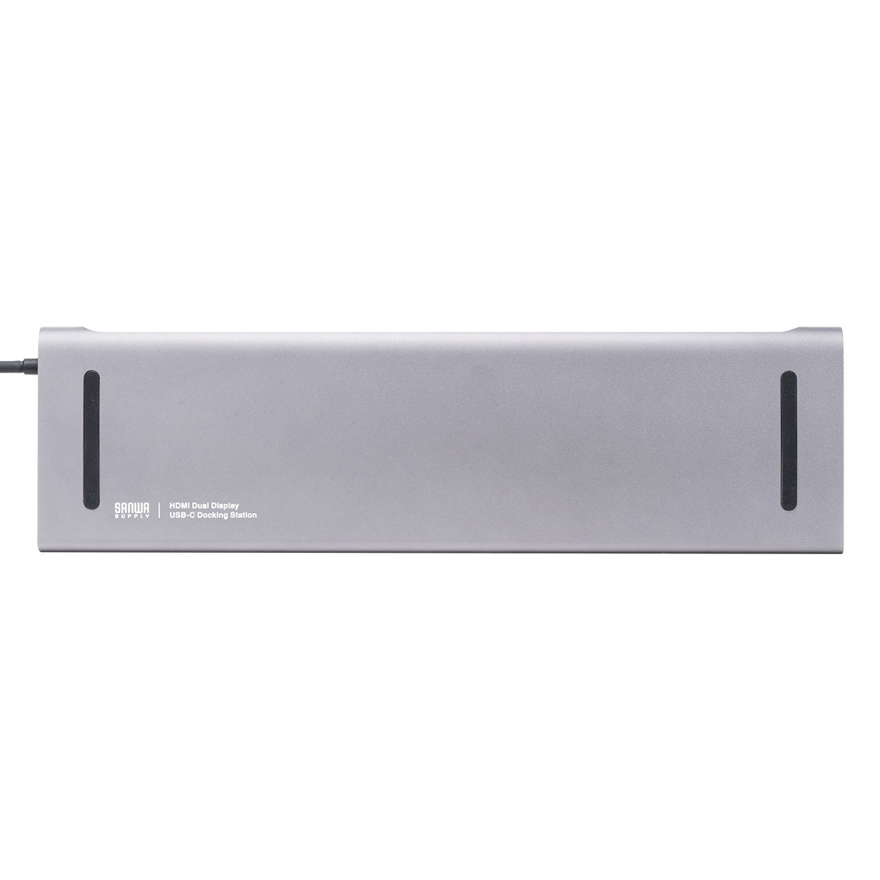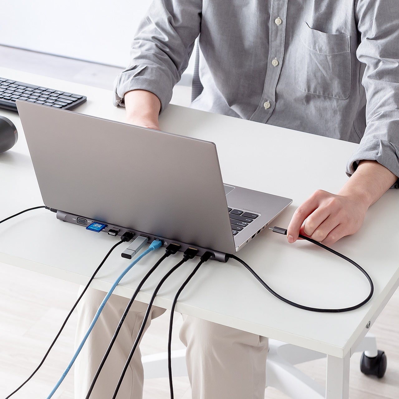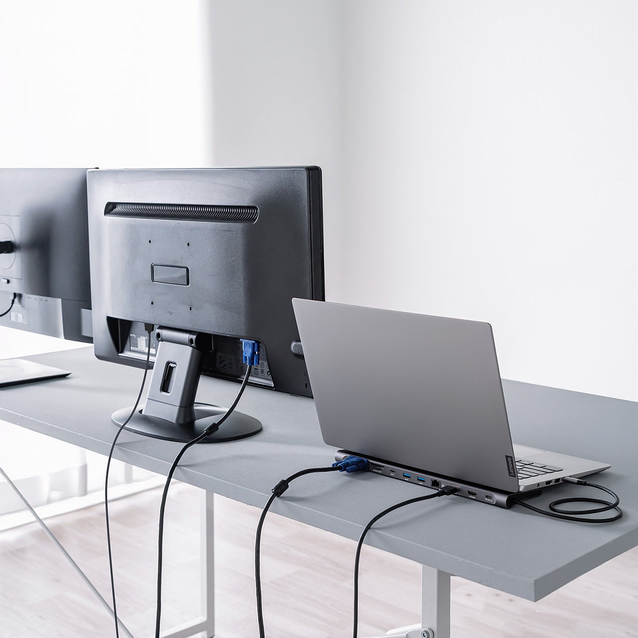 本製品は、USB Type-Cケーブル1本でディスプレイへ最大2画面出力(HDMI×2+VGA×1)ができるドッキングステーションです。