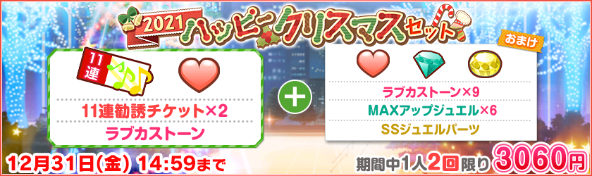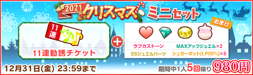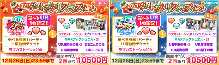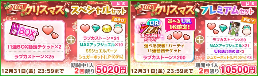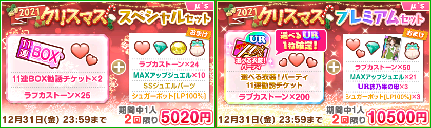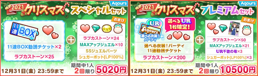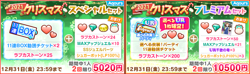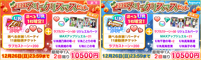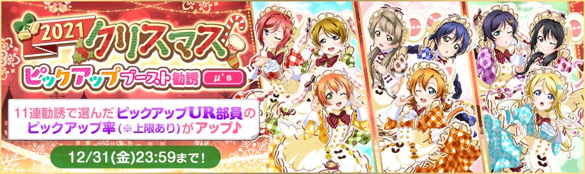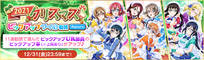 ・「2021クリスマスピックアップブースト勧誘〜μ's〜」および「2021クリスマスピックアップブースト勧誘〜Aqours〜」の11連限定勧誘スタンプカードの5個目では、11回の勧誘とは別にピックアップブースト選択対象であるUR部員が等確率で排出される1回勧誘が行われます。