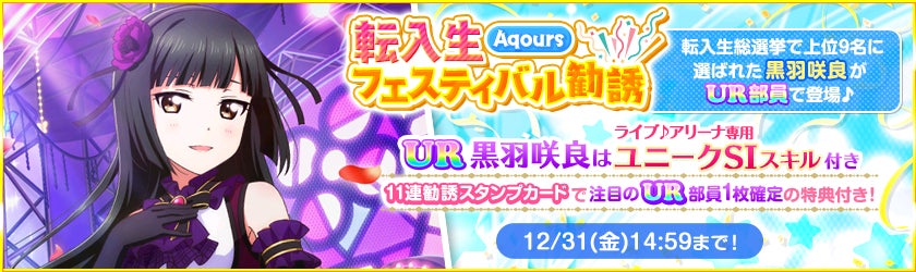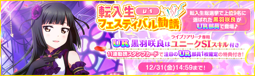 ・UR黒羽咲良は「転入生フェスティバル勧誘〜μ's〜」および「転入生フェスティバル勧誘〜Aqours〜」の終了後、1/5 16:00以降のμ's特待生勧誘と1/20 16:00以降のAqours特待生勧誘から排出されます。