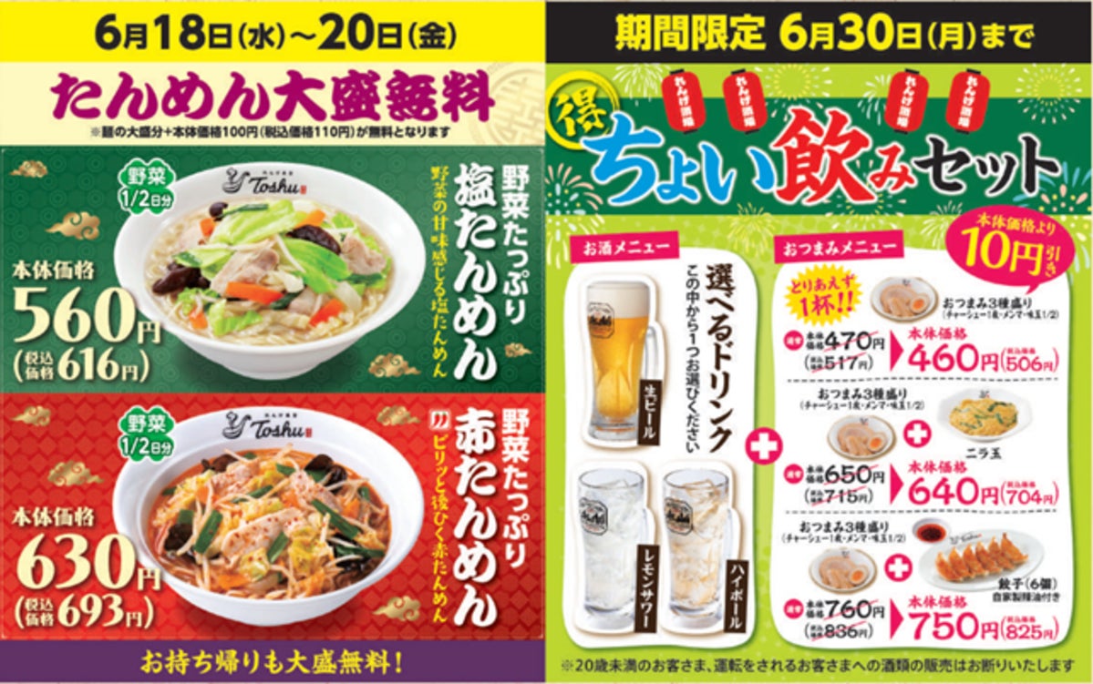 当店では、6月18日(水)〜20日(金)の3日間限定で、野菜たっぷりの人気商品「塩たんめん」本体価格560円(税込616円)と「赤たんめん」本体価格630円(税込693円)の大盛りが無料になるキャンペーンを実施するほか、6月30日(月)までの期間限定で、生ビールやハイボールなどの選べるドリンクと人気おつまみがセットになった「ちょい飲みセット」を本体価格より10円引きで提供するお得なセールを開催します。