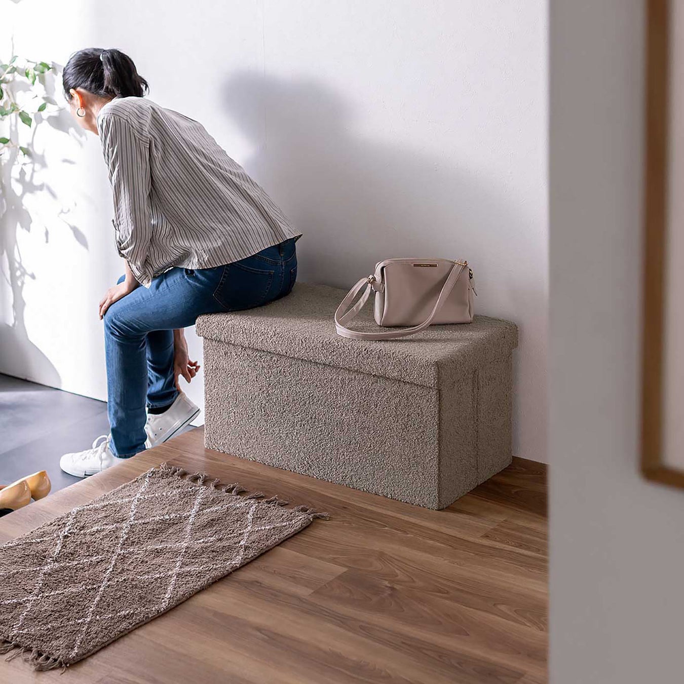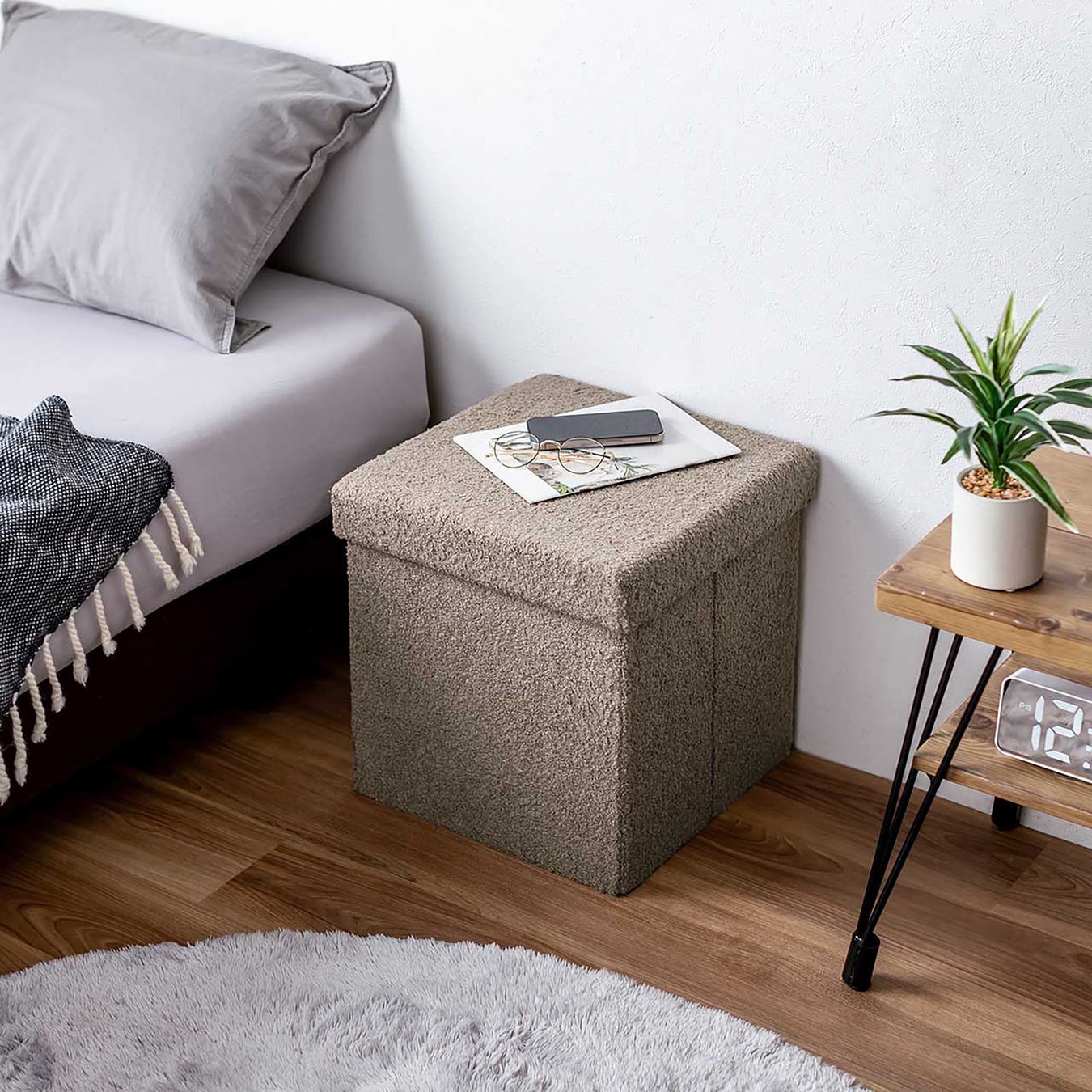 小物をスッキリ収納できる、ボア生地で座り心地抜群な収納スツール