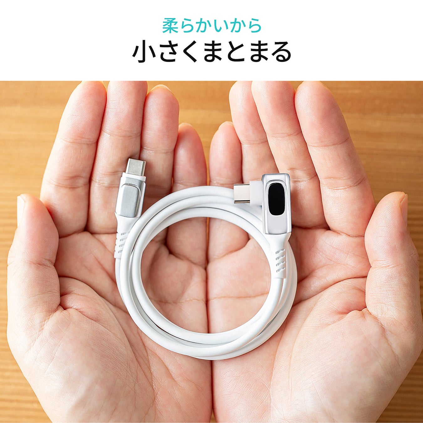 しなやかでコンパクトになり取り回しがしやすいシリコン仕様のPD電力表示機能が付いた人気のUSB Type-CケーブルのL字コネクタタイプ
