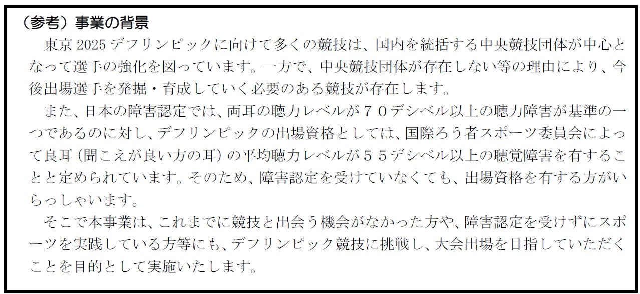 全国から即戦力となる方を見つけ、大会への出場につなげることで、東京2025デフリンピック全体を盛り上げていきます。競技未経験の方もお申込みいただけます。多くの方の御参加をお待ちしています。