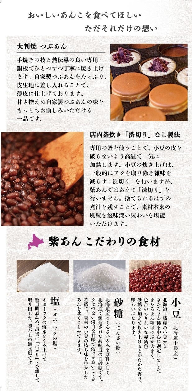 『紫あん』の“つぶあん”は十勝産小豆に北海道産てんさい糖と少量のオホーツクの塩を使用し保存料は一切使わず、さらに一般的にはアクを取り除くために行う「渋切り」をあえて行わないことで、素材本来の風味と滋味深い味わいをご堪能いただけます。甘さ控えめな“つぶあん”は、毎日店内で炊き上げ、消費期限を短縮することで実現いたしました。この上品な自然の甘さのつぶあんをたっぷり入れ、専用銅板で1つ1つ丁寧に焼き上げた大判焼と店内で作る手包みのおはぎ、そして自家製つぶあんをそのまま凍らせたアイスバーなど自慢の商品をお届けいたします。