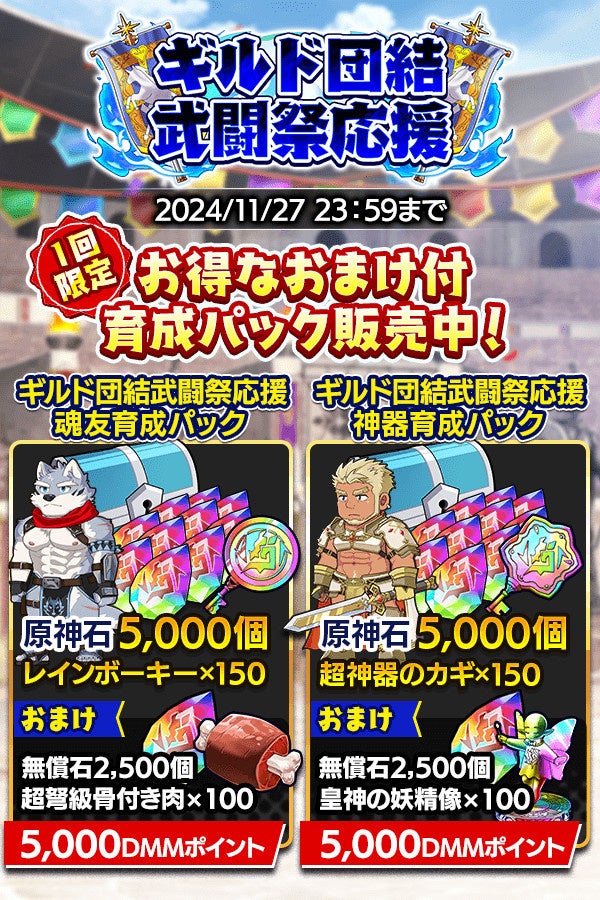 さらに、レインボーキーや超神器のカギがセットになった「ギルド団結武闘祭応援育成パック」も2種登場!おトクに原神石を購入できるチャンスですのでお見逃しなく。