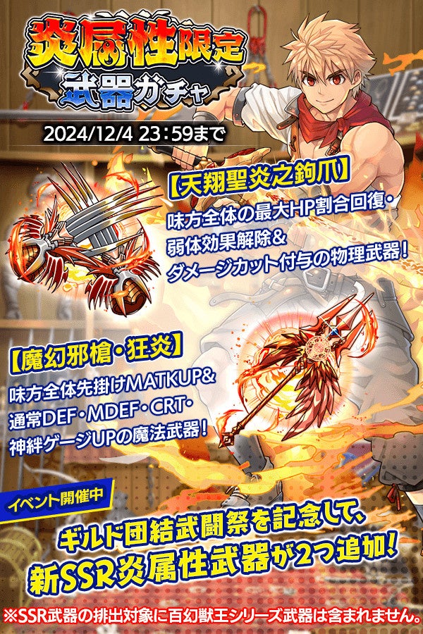 また、武器ガチャに「魔幻邪槍・狂炎」「天翔聖炎之鉤爪」の2種が追加!イベント報酬の炎属性限定武器ガチャチケットでも入手可能ですので、ぜひイベントに挑戦してみてください。