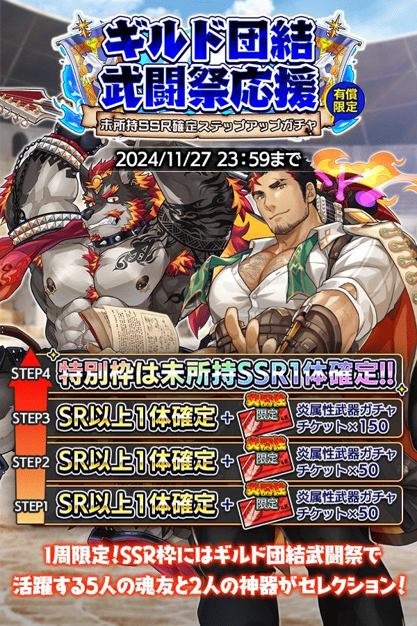 STEP3まではSR以上1体確定に加えて「炎属性武器ガチャチケット」を入手でき、STEP4では未所持SSRが1体確定する特別なガチャです。
