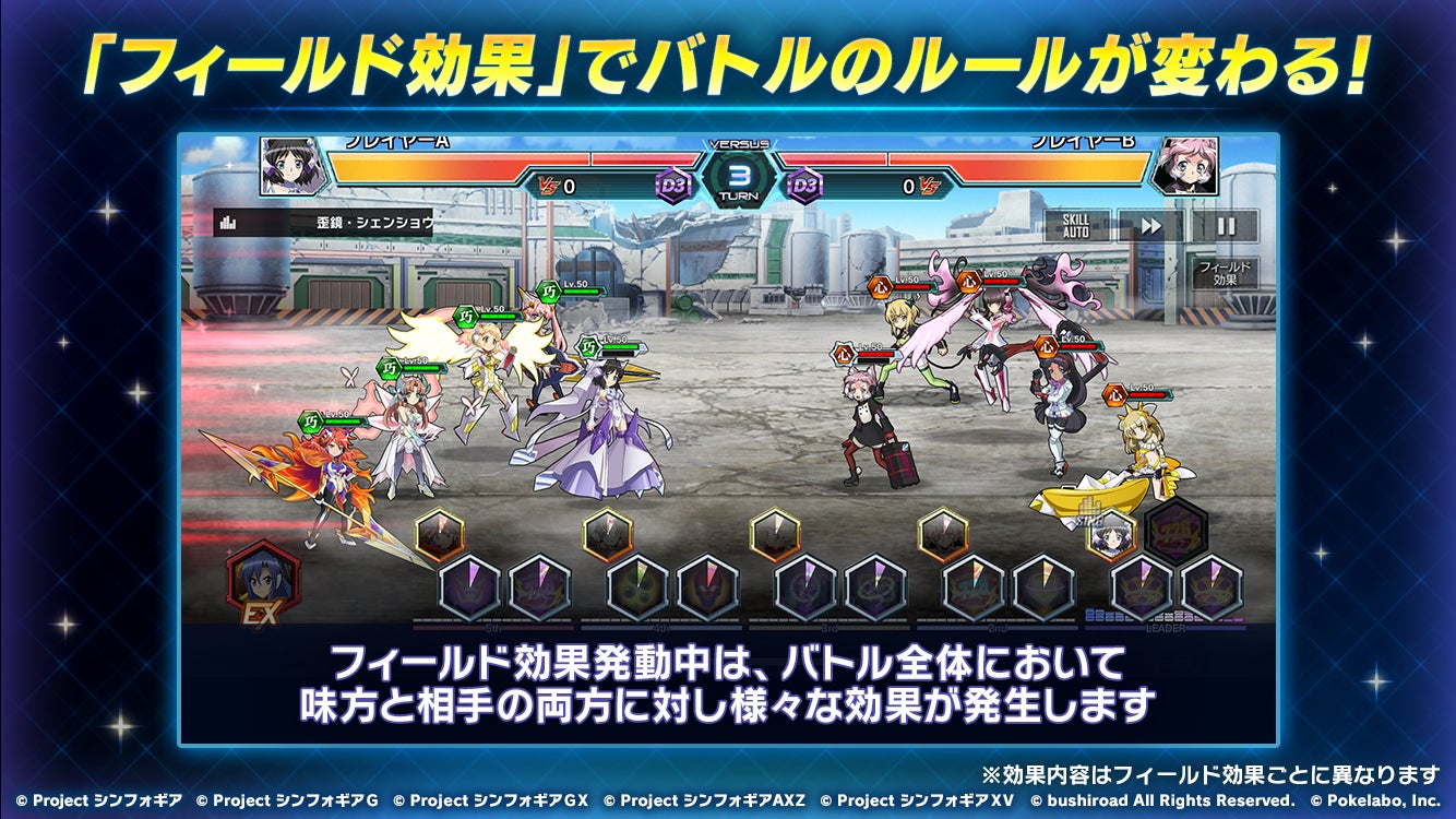 「フィールド効果」を含んだ絶技を持つシンフォギアカードをリーダーに編成し、バトル中に該当の絶技を使用することで効果が発動します。
