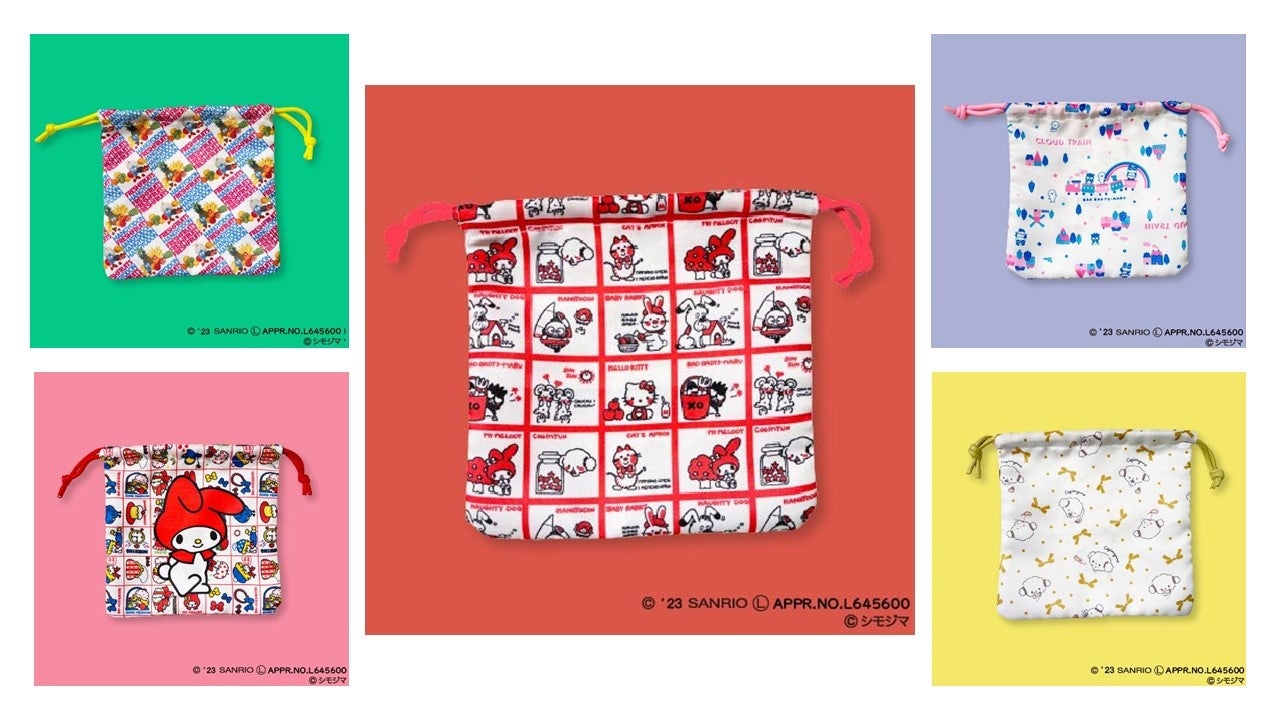 【サンリオキャラクターズ×シモジマ】巾着(サンリオキャラクターズ×ストップペイル/マイメロディ×モーニング/こぎみゅん×ニューリボン/ハンギョドン×レターフル―ツ2/バッドばつ丸×トレイン) 価格 各¥1,100(税込)
