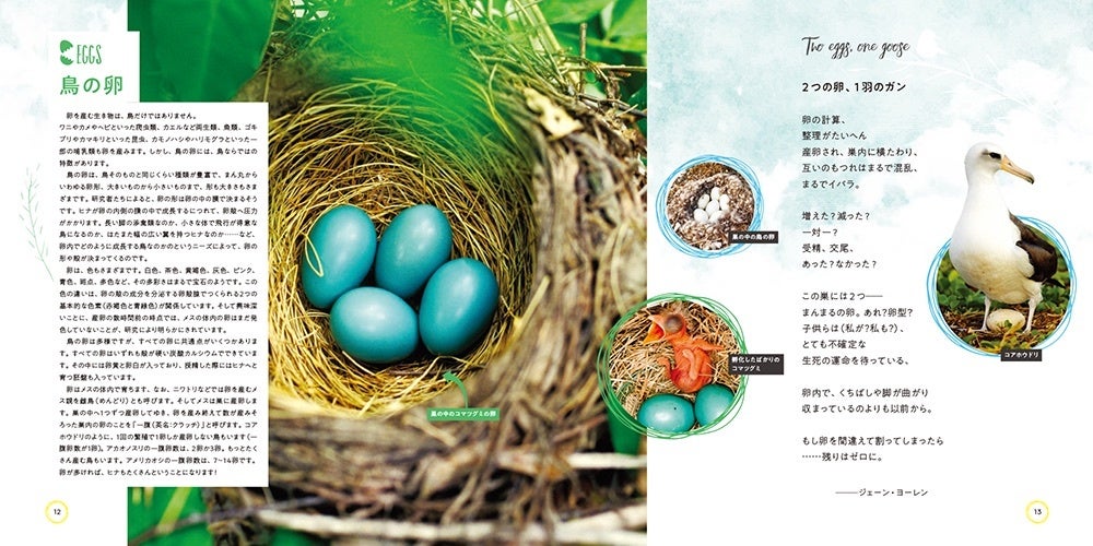 ・鳥を題材にした詩や物語なども収録し、読み物としても楽しめる