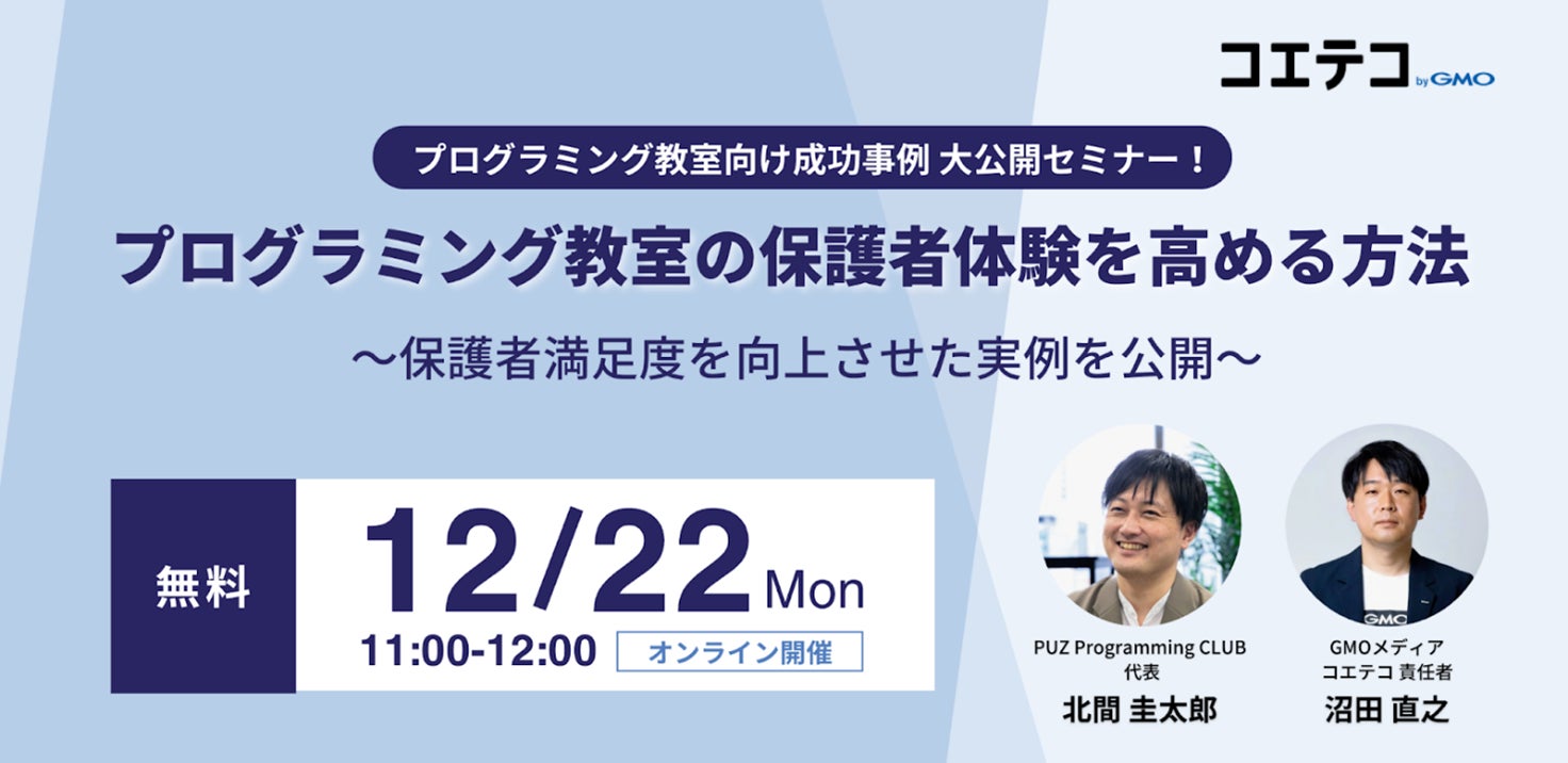 実際に「コエテコマネージャー byGMO」を導入しているプログラミング教室の運営者様をお招きし、保護者対応の改善事例を共有するオンラインセミナーを開催いたします。本セミナーでは、「プログラミング教室の保護者体験(UX)を高める方法」をテーマに、システム導入によってどのように保護者満足度を向上させたのか、現場のリアルな実例を共有いたします。