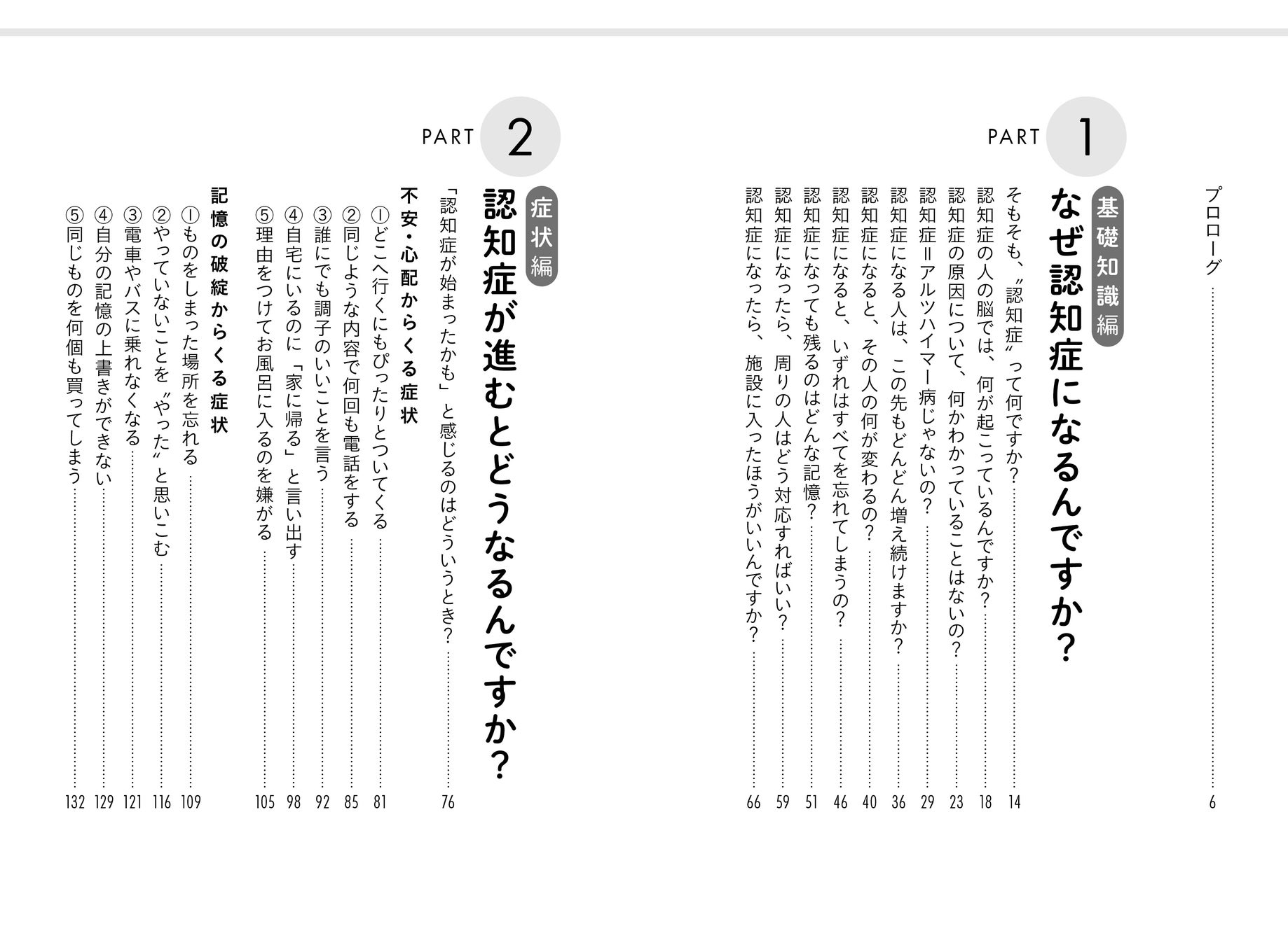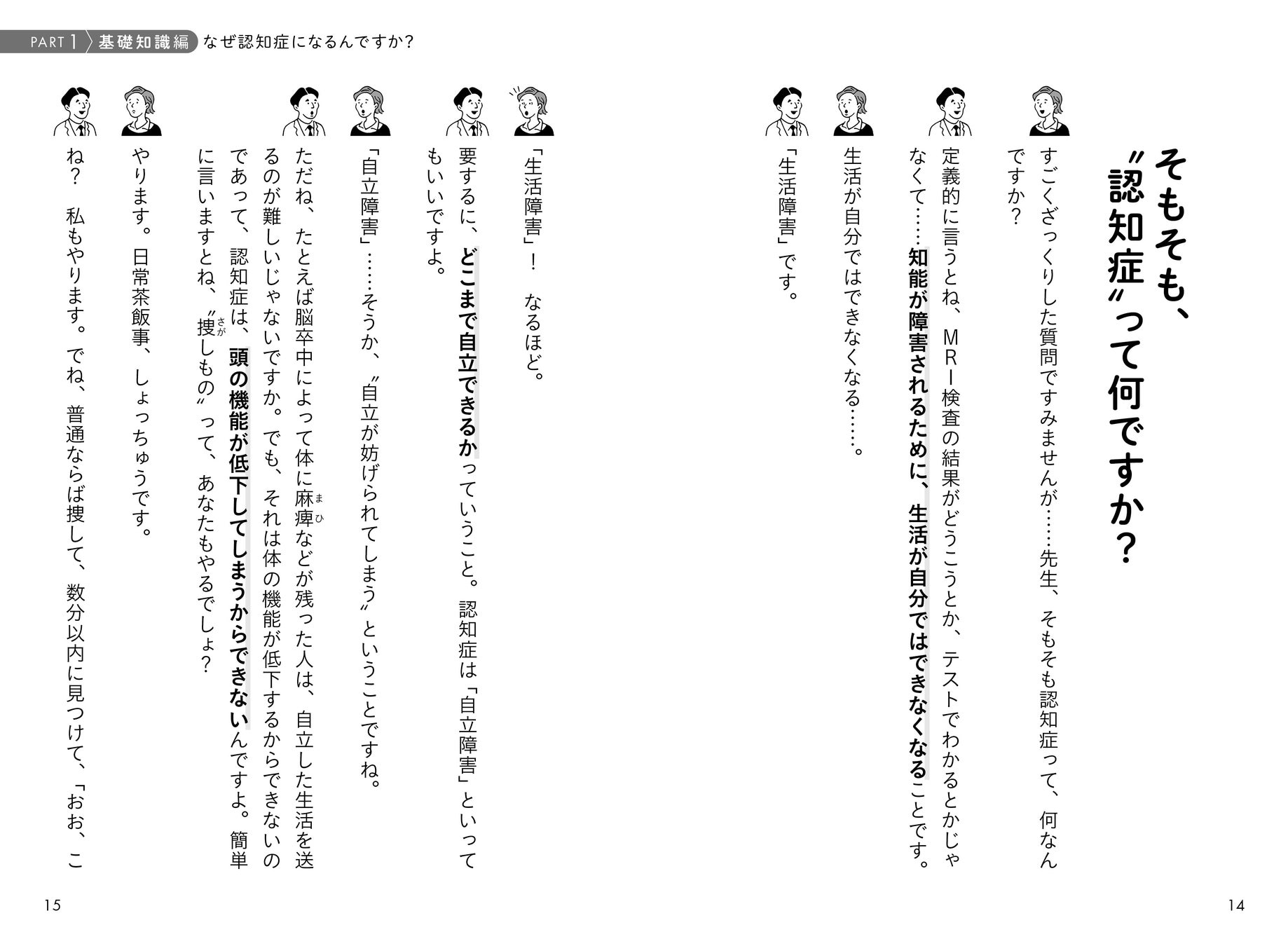 本書ではそんな認知症の基礎知識はもちろん、発症者やその家族にしか感じ得ない日々の生活における問題への対処法などを、現役の認知症専門医とひざをつき合わせて話しているようなテンポのよい文章と、ポイントをつかんだイラストをもとにひとつひとつ丁寧に説明していきます。