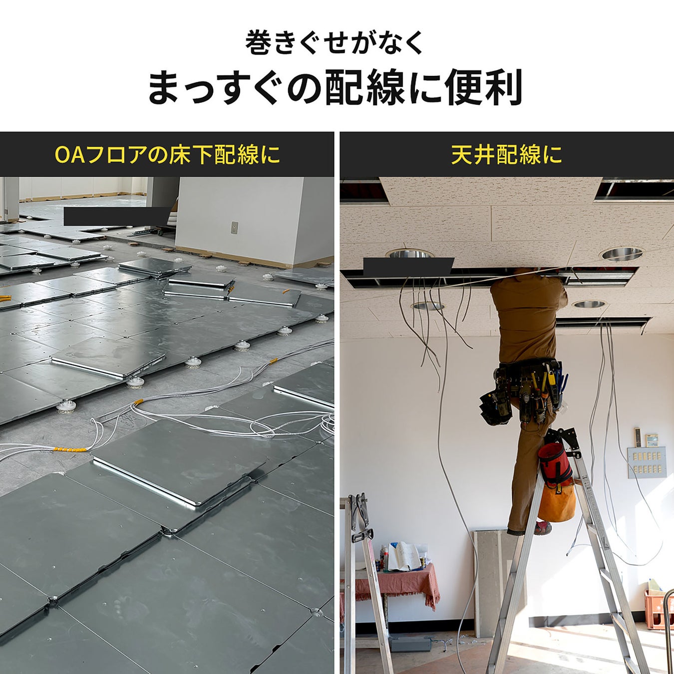1mの通線ワイヤーが10本入りでつなぎ合わせることで最大10mまで長さを調整することができます。また、まきぐせのないワイヤーのため直線的な配線作業に便利です。曲げにも対応しているので、天井や壁の中でも配線可能です。