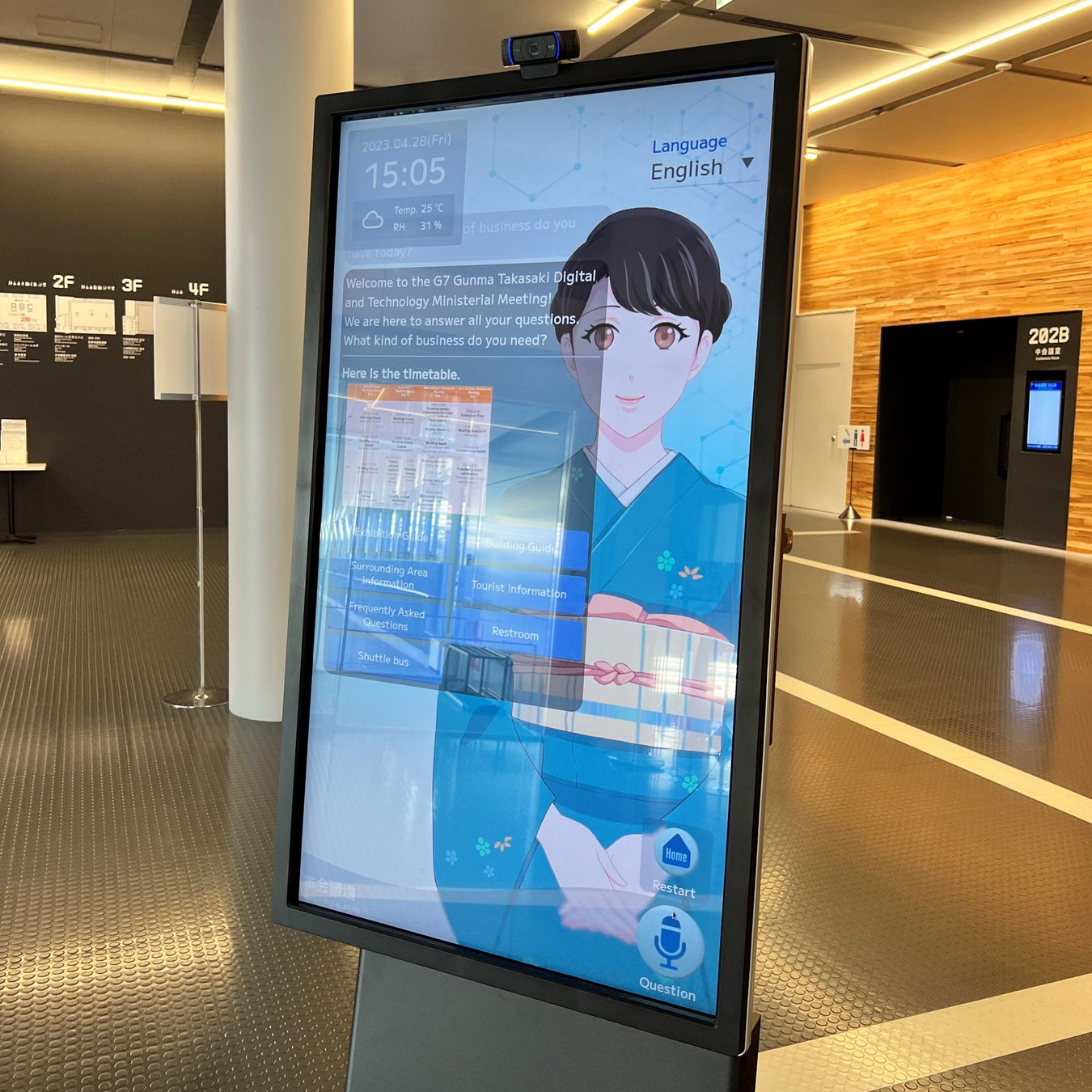 本会合では、会場エントランスロビーに設置したディスプレイ上でAI対話機能を通じて、音声認識を使った問い合わせ内容の自動応対や、チャットボットでのよくある問い合わせの回答を行いました。また、各会議のプログラムや会場施設内の情報に加え、周辺の観光情報などを無人で案内しました。今回のような国際会議で必須となる多言語でのご案内にも対応し、利便性の高い接客サービスを実現しています。