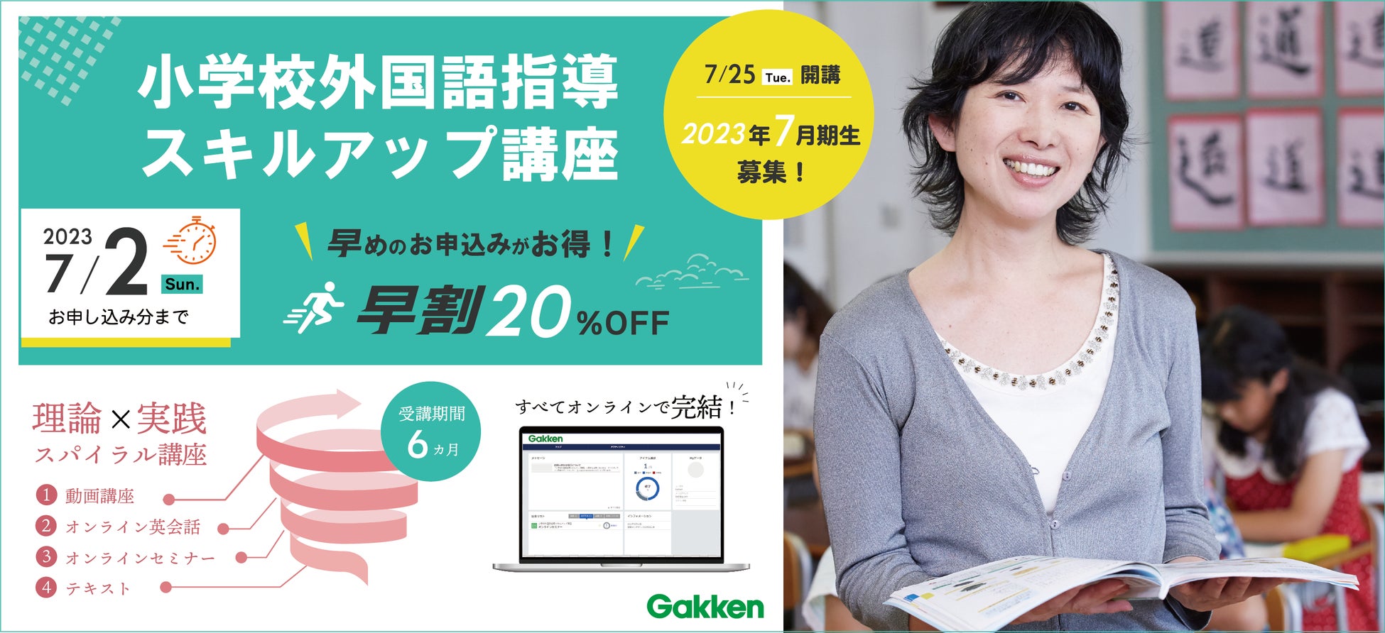 小学校外国語指導力向上のためのオンライン講座「学研 小学校外国語指導スキルアップ講座」23年7月期生募集! 7月2日申し込みまでの早割キャンペーンスタート