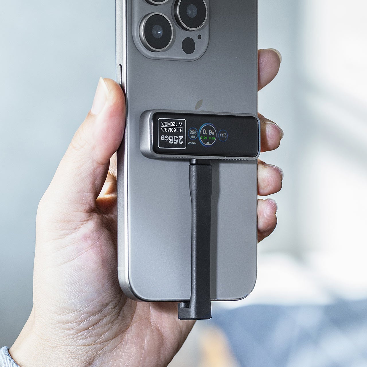 スマホのバックアップ、パソコンとのデータのやりとり、データ移動に便利です。液晶画面がついており、容量、転送速度、電力表示、本体温度の4つが表示されます。
