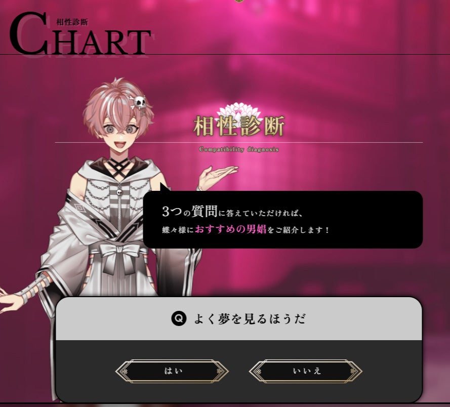 3つの質問に答えると、あなたにおすすめの「夢幻楼と眠れぬ蝶」のキャラクターを紹介してくれる「相性診断」を公式サイトにて公開いたしました。