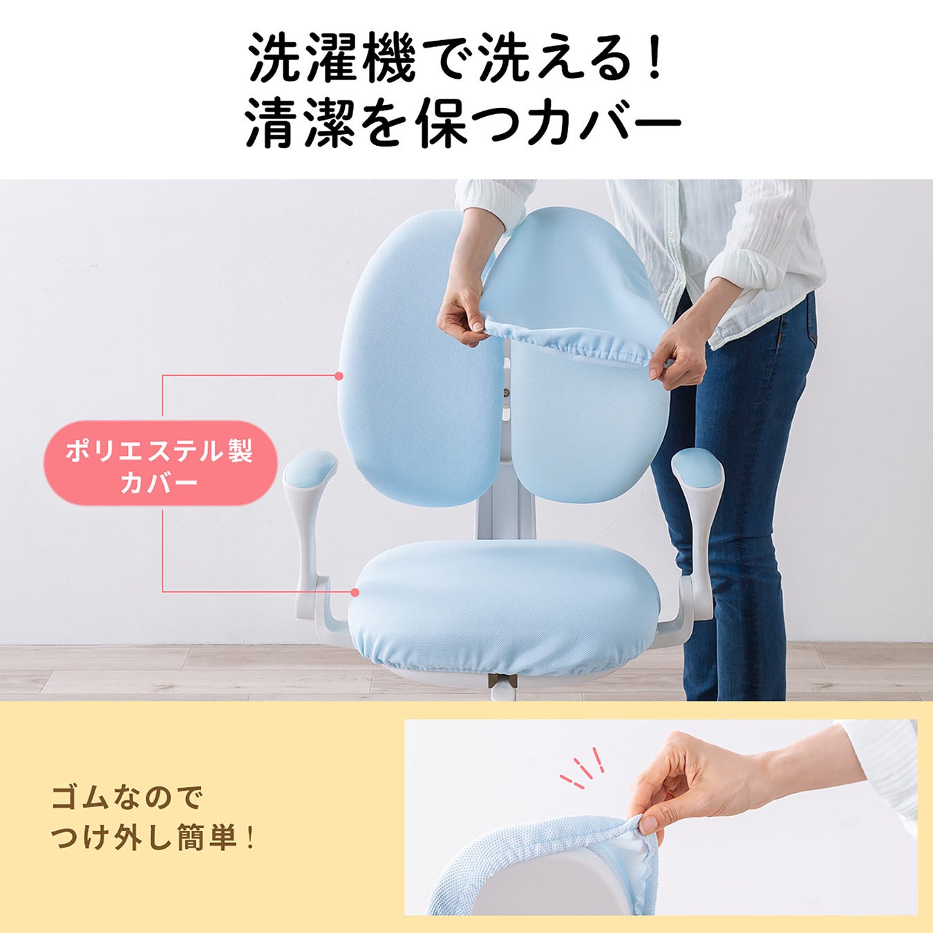 座面と背もたれには、取り外して洗えるカバーがついており、お手入れが簡単です。お子様が汚してしまうことも多い学習椅子ですが、いつでも清潔に保てるため、安心して使い続けられます。お母さんにも嬉しいポイントです。