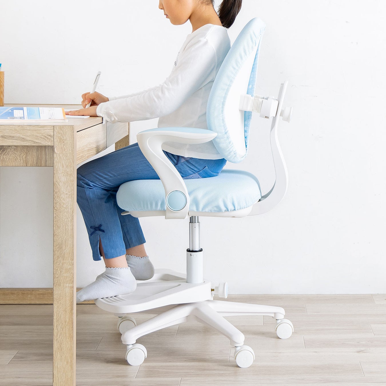 背もたれの高さ調整機能や座面奥行き調整機能があり、お子様の成長に合わせて最適な座り心地を提供します。さらに、アームレストは跳ね上げ式で、使わない時はスッキリ収納可能。子供部屋や学習机周りをすっきり保つことができます。