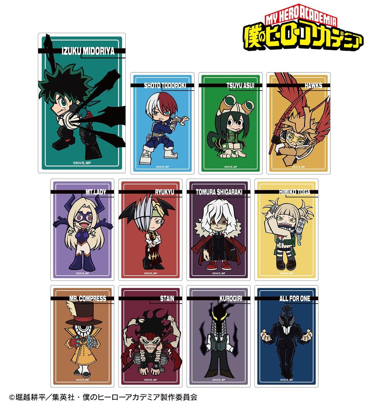 緑谷出久、轟焦凍、蛙吹梅雨、ホークス、Mt.レディ、リューキュウ、死柄木弔、トガヒミコ、Mr. コンプレス、ステイン、黒霧、オール・フォー・ワンをカードステッカーに仕上げました。