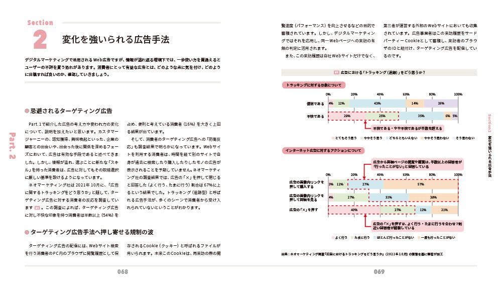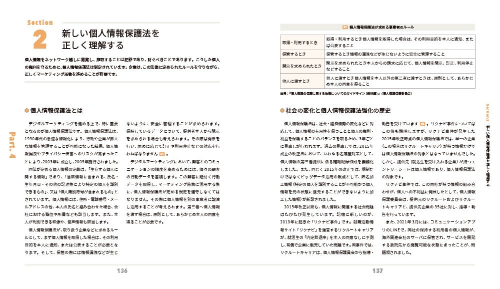 改正個人情報保護法が2022年4月に施行されたことで、企業でのパーソナルデータの取り扱いは一層厳しい対応が求められるようになり、マーケティングの手法もさらに変化しています。このような状況を踏まえて、この本では現在最新のデジタルマーケティングの全体像をわかりやすくまとめています。