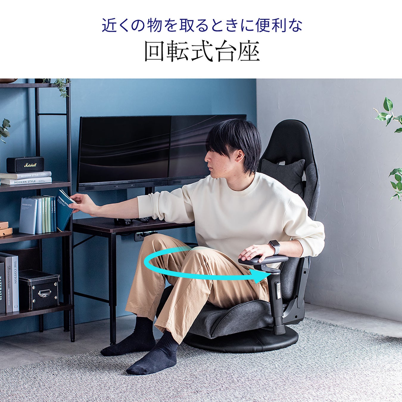 回転式台座で座る・立つの動作がスムーズに行え、生地はなめらかで上質な肌触りのスエード調生地を採用。蒸れにくいので、長時間の使用も快適で高級感とカジュアル感のバランスが抜群です。一度座ると立つのを忘れる極上の座椅子です。