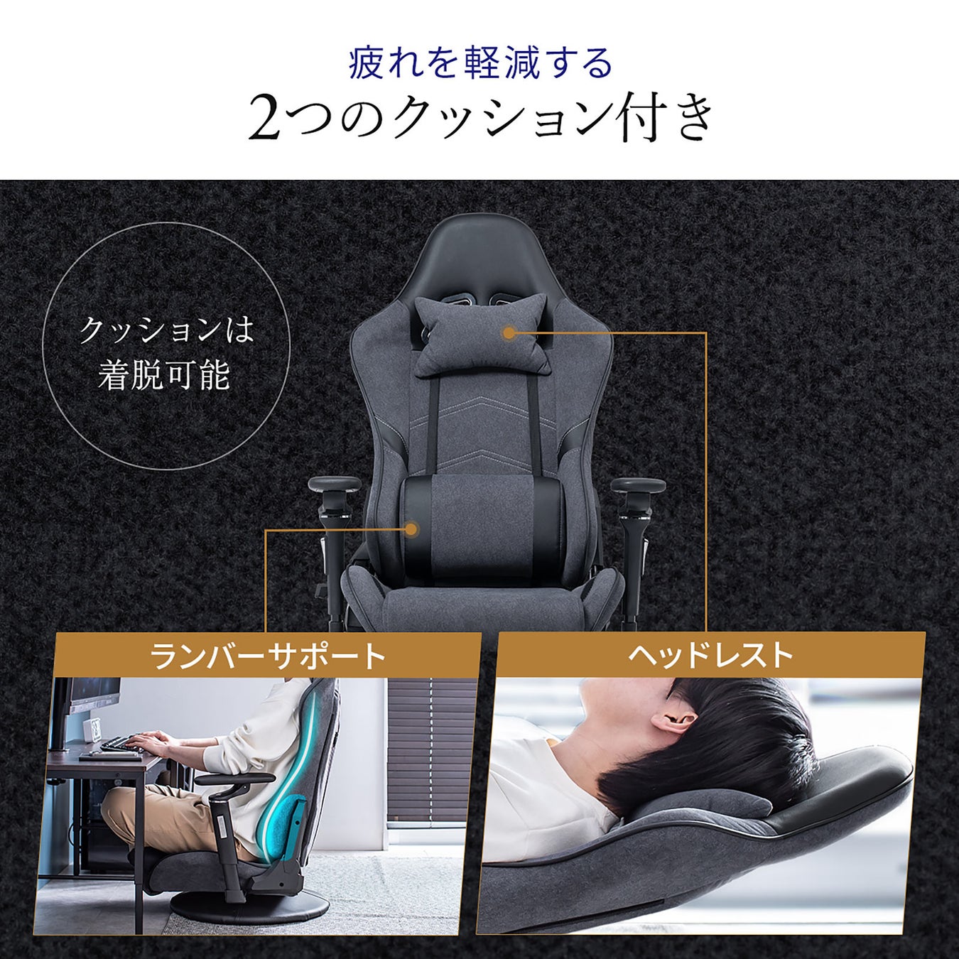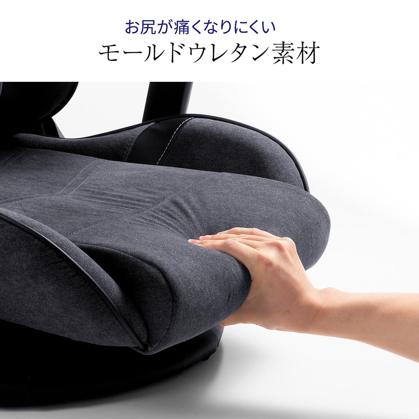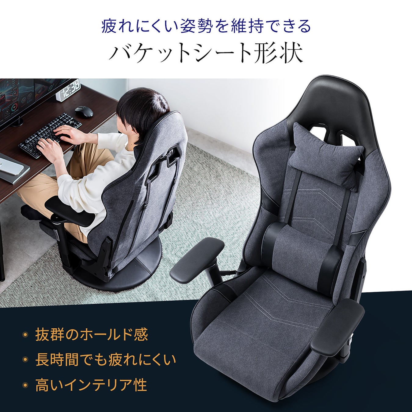 レーシングカーのコックピットに設けられているバケットシート形状を採用。包み込まれるような座り心地で、疲れにくい姿勢を維持することができます。座面はモールドウレタン素材でお尻が痛くなりにくいです。また、着脱式可能なクッション付きで腰や首の負担を軽減できます。