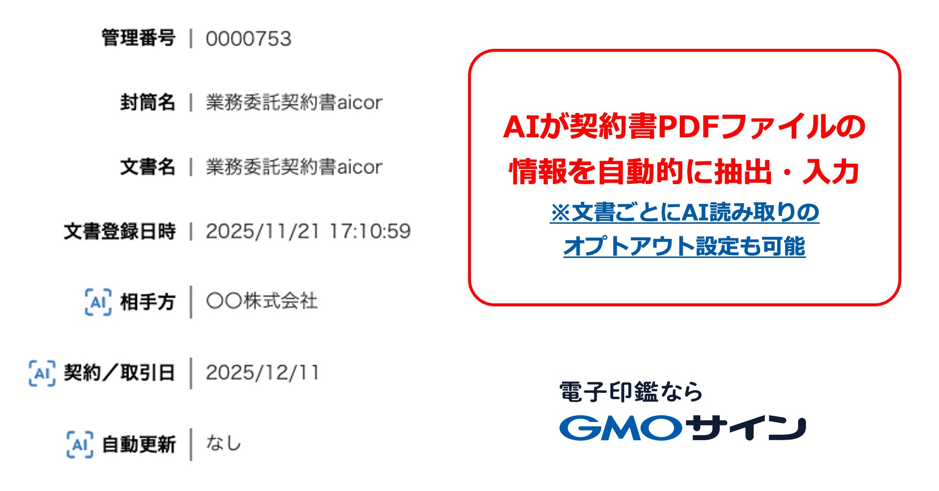 GMOグローバルサイン・ホールディングス株式会社(代表取締役社⻑:⻘⼭ 満、以下「GMOグローバルサイン・HD」)は、自社が開発提供する電子契約サービス「電子印鑑GMOサイン」(以下「GMOサイン」)において、2025年12月11日(木)より、AI OCRにより契約書データの管理を効率化する機能『AI自動入力』の提供を開始したことをお知らせいたします。