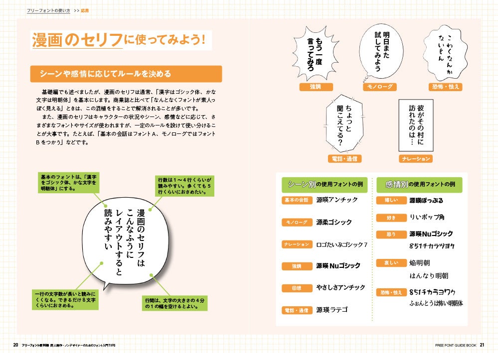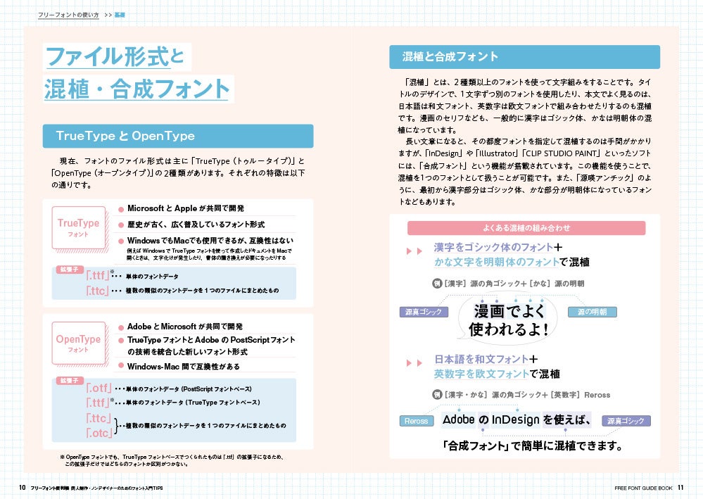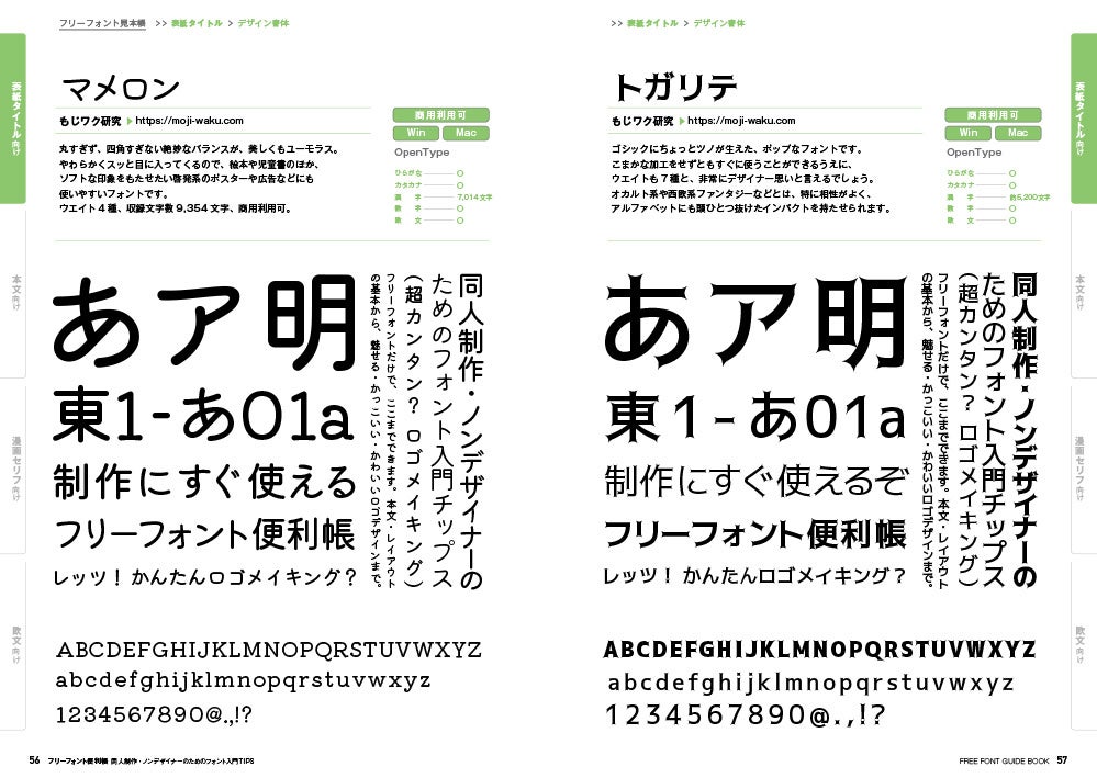 見本帳ページでは、各フリーフォントの特徴、組見本、配信元URL、使用許諾範囲や収録文字数を掲載。巻末には、フォント形式や使用許諾範囲がひとめでわかる、便利な早見表が付属します。